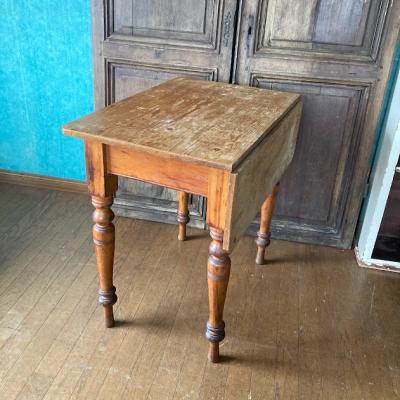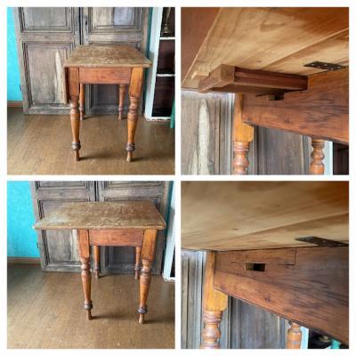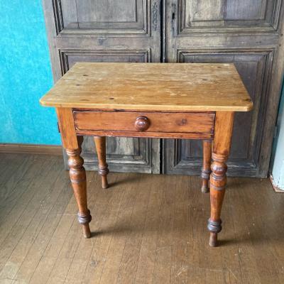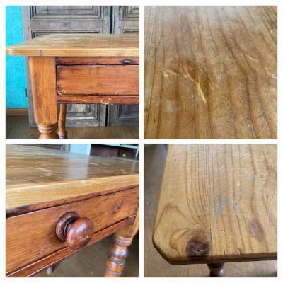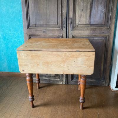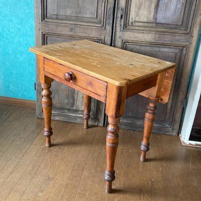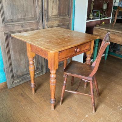片側が折りたたみできるパインテーブル【42-94】約77㎝ほどのサイズは一人暮らしにも使いやすいサイズ。引き出しの反対側がたためるので普段は壁に付けて使用し、来客があるときや作業スペースが欲しい時だけ広げてゆっくり使えます。小物を収納できる引き出しも便利ですね!天板を広げるときは、収納されている木製のパーツを引っ張るだけなのでとても簡単です。イギリス製、推定1940年代のテーブルですので、アンティークらしい凹みや小さな傷を含みます。これからの生活を共に過ごしてくれる小さなテーブルをお探しの方におすすめ