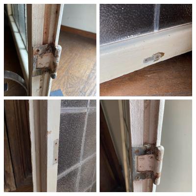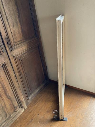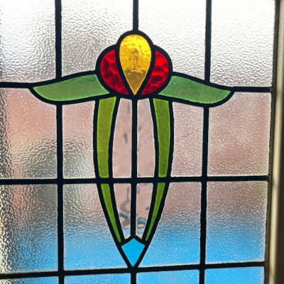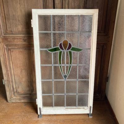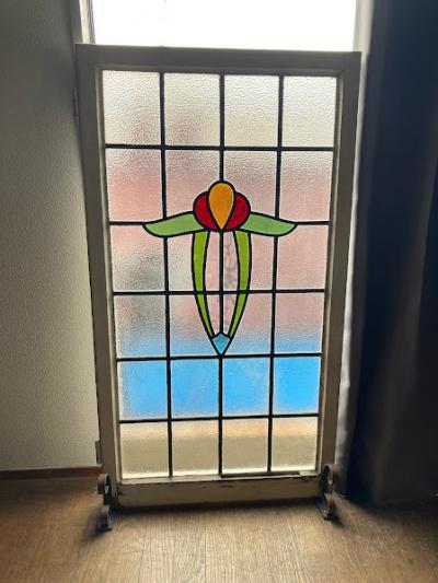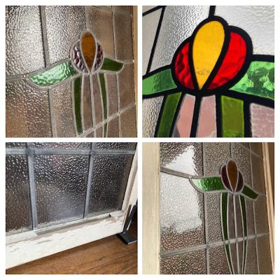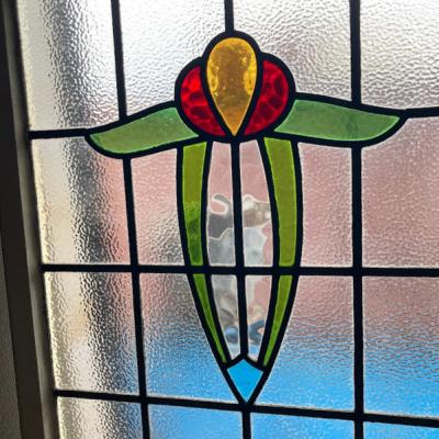 凹凸のあるガラスで囲まれた大きなステンドガラスが届きました【43-255】色合いからお花をイメージする方が多いと思いますが、流氷の天使と呼ばれるクリオネにも見える愛らしいデザインです。ほんのりと光は通しますが、ガラスの凹凸があることで中が見にくくプライバシーの保護にも一役かっています。周りの木枠にはパーツを取り外した跡やパテが外れた箇所がありますが、施工の前に壁に合わせた色に塗装すると素敵ですね。側面には特殊な形状の丁番が2カ所付属。ガラス内には古いガラスの特徴である気泡を含みます。朝日や夕陽の差し込む窓辺におすすめ。イギリス製、推定1930年代