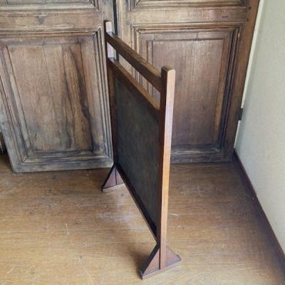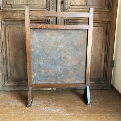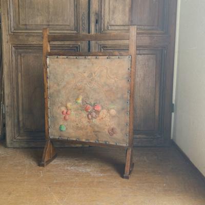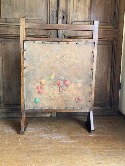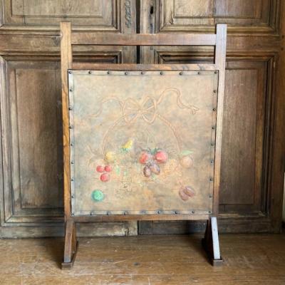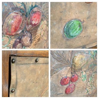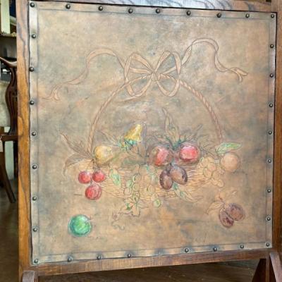 レザーにフルーツバスケットを描いたファイヤーフェンスが届きました【43-391】モチーフの部分は凹凸を作り立体感が出るように工夫されていました。彩色された部分は経年によりポロポロと剥がれ落ちる箇所がありますが、時代を感じさせてくれるたたずまいです。全体的に落ち着いたトーンで描かれていますので、届いたその日からお部屋に馴染む色合いのフェンスをお探し方のにおすすめ。イギリス製、推定1940年代。福岡市南区の店舗にてお渡しもできますのでお気軽にどうぞ!