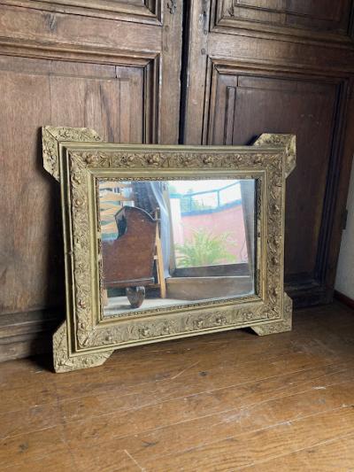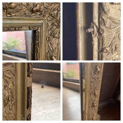 何度も修復されながら大切に使われてきた鏡が届きました【30-12】フランス製、推定1930年代。画像で分かる通りパーツが外れたり、欠けたりしていますが、それらが独特の雰囲気を演出してくれています。古いガラスのためガラス内部に特有の黒いシミ、重量は約6キロほどあります。店舗やご自宅でシャビーシックな空間を作りたい方、撮影小物をお探しの方におすすめ
