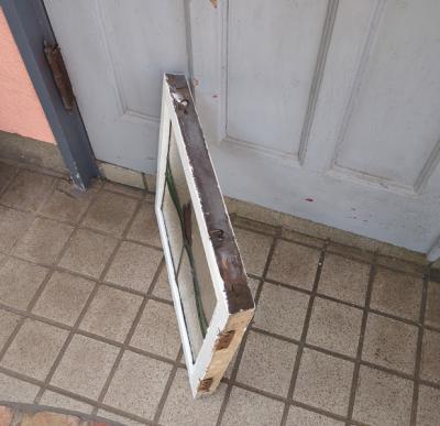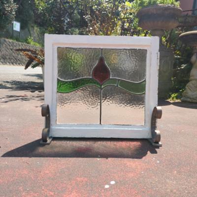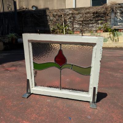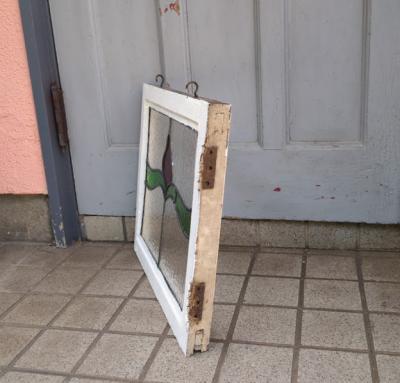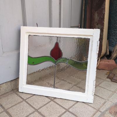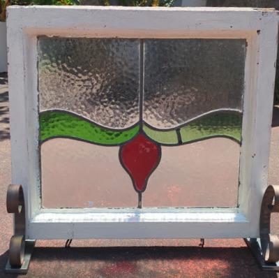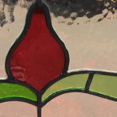 一輪の赤いつぼみを思わせるシンプルなステンドガラス【38-286】お好みで上下どちらでも楽しめそうなデザイン。一か所のみ補修カ所があるため価格に反映させてあります。すべてのガラスはメラメラタイプの不透明ガラスを使用してありプライバシーも安心ですね。サイドに丁番が2カ所付属。アンティークのガラスらしい気泡を多く含みます。窓際にぱっと目を引くアクセントが欲しい方におすすめ。福岡市南区の店舗にてお渡しもできますのでお気軽にどうぞ!破損を考慮し木枠の取り外しは行っておりません。