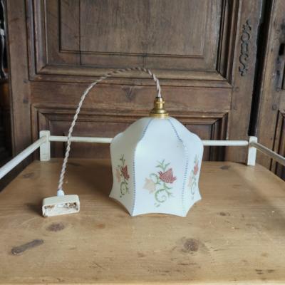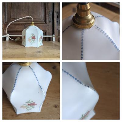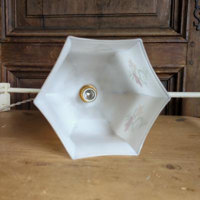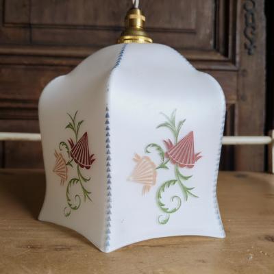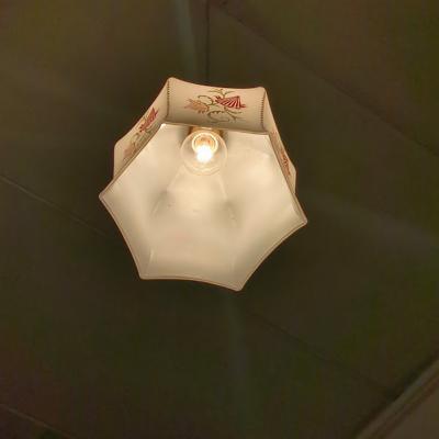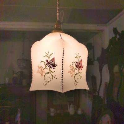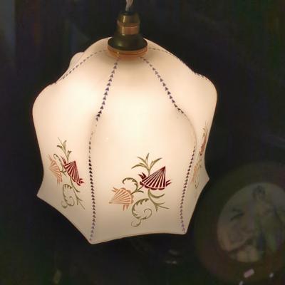 ボタニカルデザインが美しいガラスシェードが届きました【44-207】真ん中あたりにくびれがあることでスッキリした印象です。四方に描かれ小さな三角形が連なるデザインがシェードのデザインを引き立ててくれていますね。ところどころにデザインが剥がれた部分、真上にある真鍮の留め具付近に小さなカケがありますが、下からは見えませんので安心してご利用いただけます。ほんのりと空間を照らしてくれますので、落ち着いた空間を演出したい方におすすめ