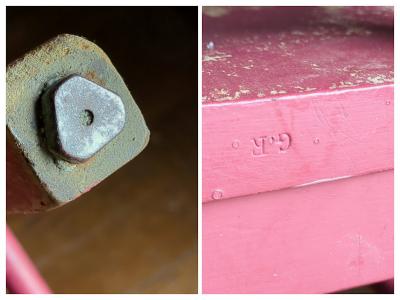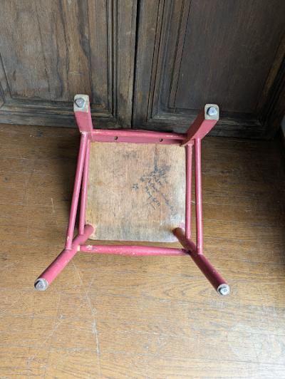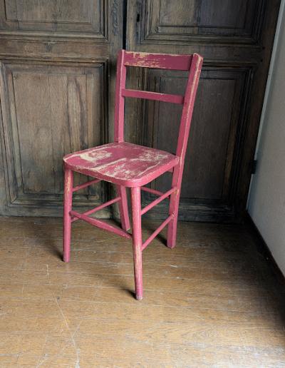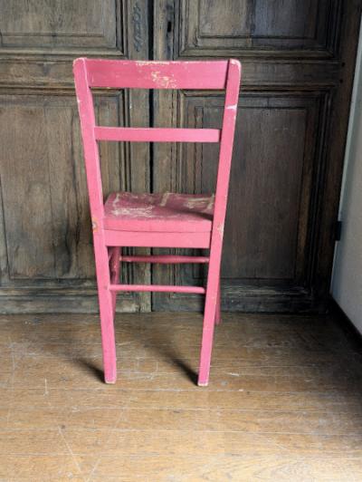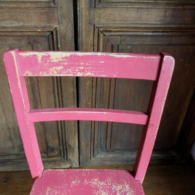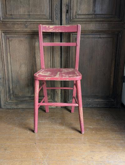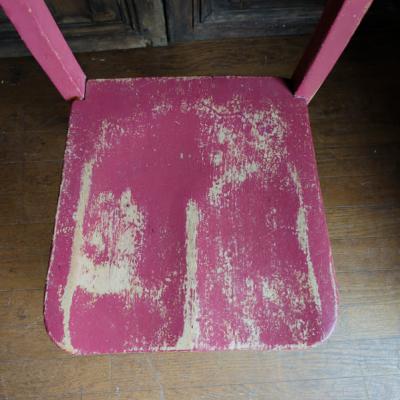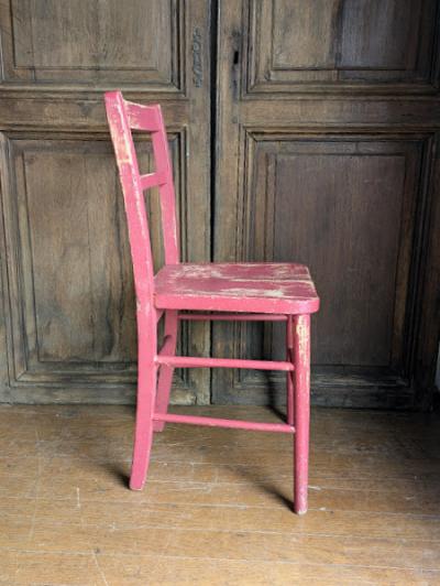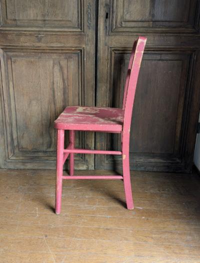 鮮やかな濃いピンクに包まれた椅子が届きました【41-71-C】ペイントの剥がれや、補修の跡から多くの人に長く使われていたことがわかります。裏面には誰かの落書きも残っていますが、この椅子が愛された証なのでそのままにしてあります。脚の底には補強のための金属パーツが取り付けられています。キッチンチェアやお気に入りコーナーのアクセントなどにおすすめ。福岡市南区の店舗にてお渡しもできますのでお気軽にどうぞ!イギリス製、年代不詳