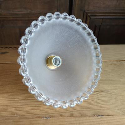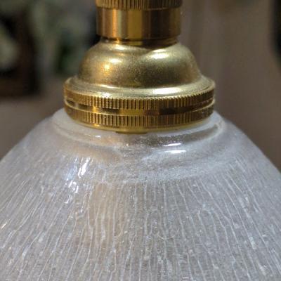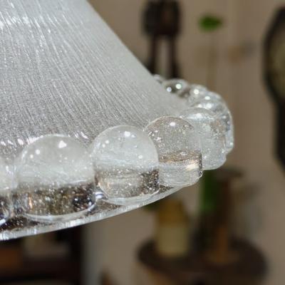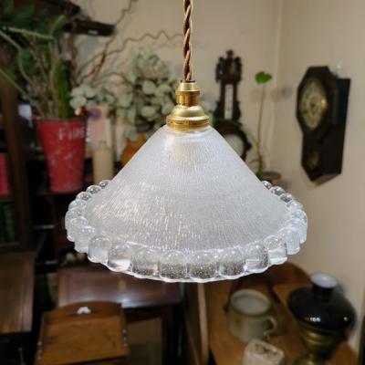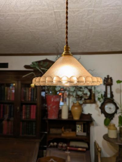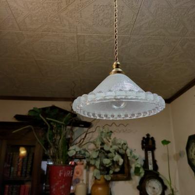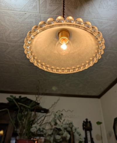 ぷっくりとしたデザインのフランス製ガラスシェードが届きました【44-64-C】無数の気泡をまとった姿は宝石のように輝き、心をときめかせるたたずまいです。同じデザインのものがありますのでペアで使ってもいいですね!外側はつるんとした質感で、内側はマットになっています。口金部分に約5mmほどの小さなカケがありますが、下からは見えませんのでご安心ください。年代不詳