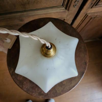 幾重にも重ねられた柔らかな白い部分は鳥の羽のように美しく、灯をともせばまるで雲間から光が差し込むような幻想的な輝きを見せます。優しい印象のこの照明は、お客様を迎える玄関やリビングなどで活躍しそうですね。イギリス製、推定1940年代