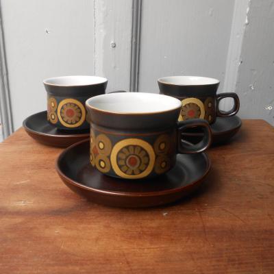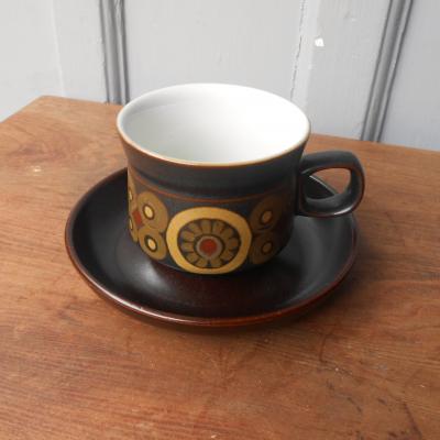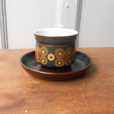 1960年代から70年代にかけて特に人気を博したデザインです。デンビー社は1809年に創業し、クラフトマンシップを重んじた陶器製品の製造で知られています。このシリーズは、独特の模様と温かみのある色彩が特徴で、当時の英国の家庭文化やデザインの潮流を色濃く反映しています。