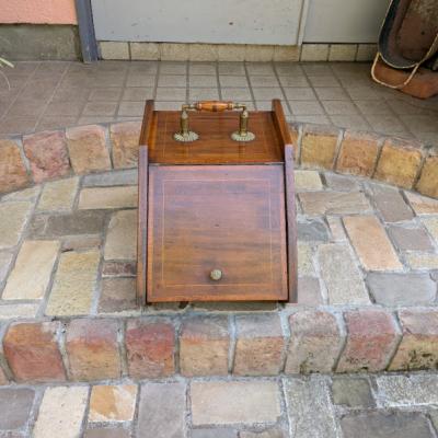 艶やかなマホガニーのコールボックス【43-326】は、ヴィクトリア時代のイギリス文化を体現する美しいデザインが特徴です。石炭を収納するための機能的な工夫や、使用の歴史を物語る擦り傷が魅力的。現在ではスリッパを入れたり小物収納など、現代の生活にも溶け込む多用途なお品です。ある程度のクリーニングは行ってはおりますが、落ちきれない炭が残っている場合があります。収納をされる場合は一度内部をしっかりとご確認ください