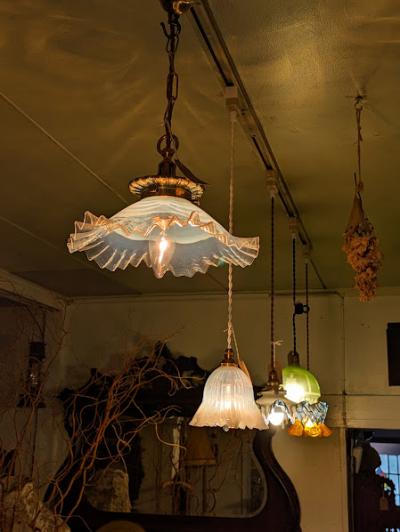 淡いブルーを帯びた乳白色のシェードが、点灯時には柔らかな光を広げ、お部屋全体を包み込むような優しい雰囲気を演出します。波打つフリル状の縁は花びらのように繊細で、真鍮の金具やチェーンとの組み合わせが上品な印象です。