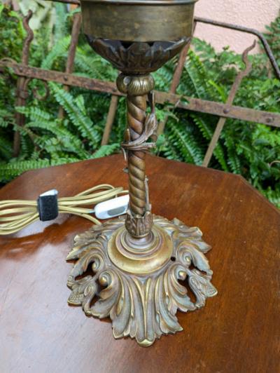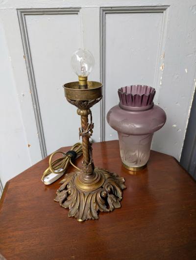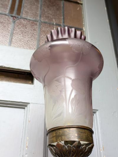 真鍮で造られたアールヌーボーの美しい植物をモチーフにしたクラシカルな装飾が施され、時代を経た風合いが魅力です。シェードは淡いアメジスト色のグラデーションガラスに繊細な模様が入り、灯りをともすと柔らかく幻想的な光を放ちます。