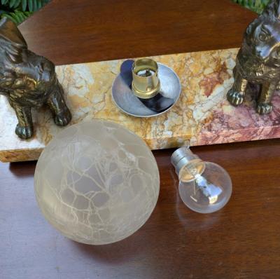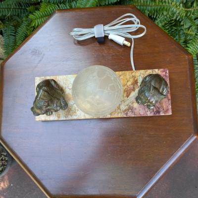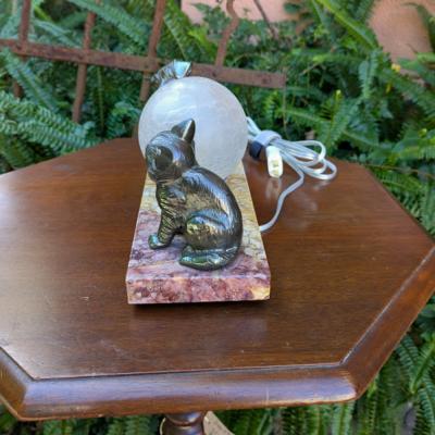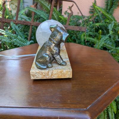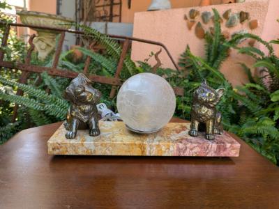 大理石のベースに愛らしい犬と猫のブロンズ像を配し、中央にはクラックルガラス(ひび模様入り)の球体シェードを備えています。点灯すると柔らかな光がガラスを透かし、温かみのある幻想的な雰囲気を演出します。