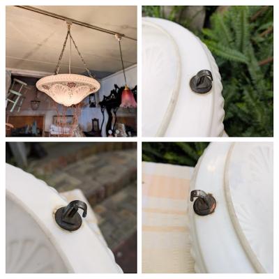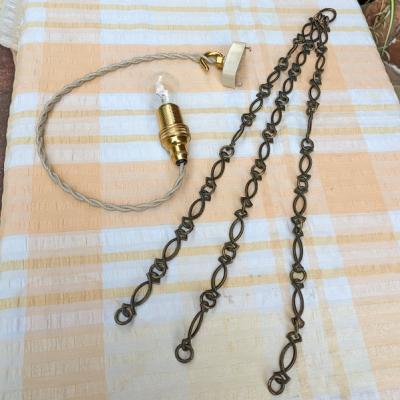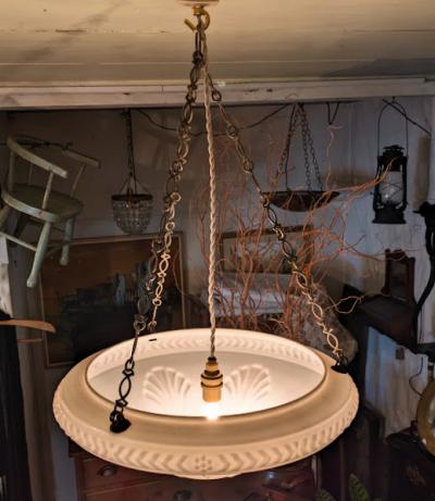 3本のチェーンで吊り下げるだけのシンプルな構造ですので、角型シーリングのフックにそのまま吊り下げてください。大きなダメージはありませんが、長きに渡り使われてきた証として小さな傷や落ちきれない汚れを含みます。