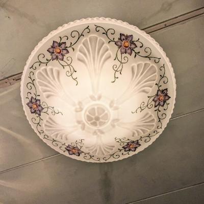 花のモチーフはクレマチスを思わせるデザインで、優美な曲線装飾がアールデコの雰囲気を漂わせます。当時の英国ではこのような自然主義的な植物モチーフが多く取り入れられていました。光源が直接目に入らない仕様なので、光を通すとガラス全体がふんわりと発光し、空間をやさしく照らします。ダイニングや玄関照明に取り入れると、英国アンティークらしい温もりのある雰囲気をお楽しみいただけますよ。