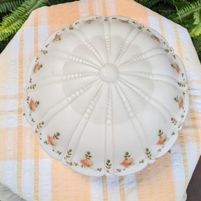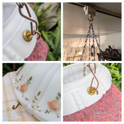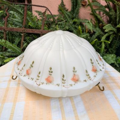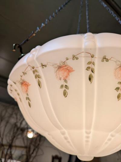 乳白色のガラスシェードには、ピンクローズに手書きの葉っぱが丁寧にあしらわれた愛らしいハンギングシェード【45-259】