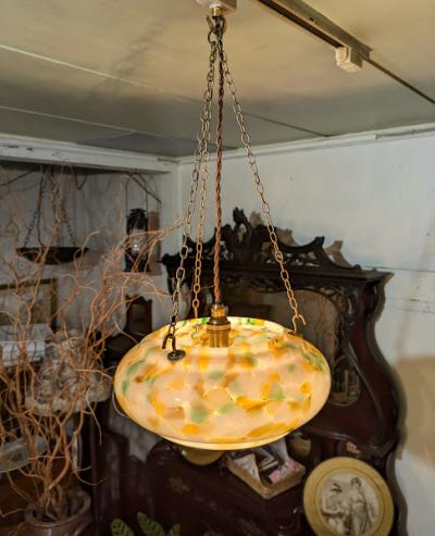 重なりあったモザイク模様が大変美しく、点灯すると優しい光が広がり、空間をふんわりと包み込みます。ヨーロッパで広く使われた3点チェーン吊りのクラシックなスタイルで、アンティークらしい雰囲気がしっかりと感じられる一品です。ガラスには小さな気泡を多く含みます