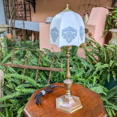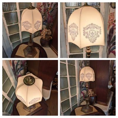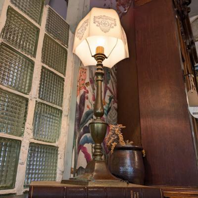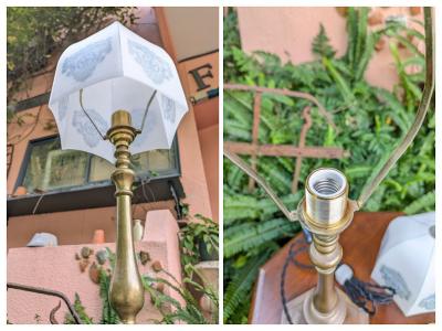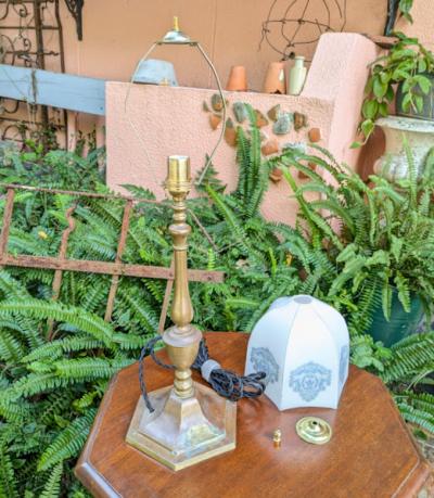 時代を経て鈍い色合いに変化した真鍮製のランプベースに、水色のレース模様が美しいガラスシェードの組み合わせ【45-316】