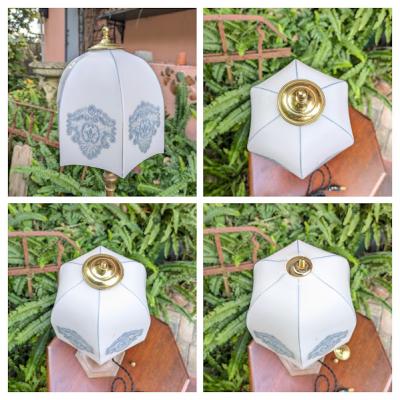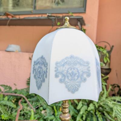 シェードは六面体のやわらかなカーブを描く形状で、各面にはブルーグレー調のクラシックな装飾模様が入っており、20世紀初頭(おそらく1920~1940年代頃)のヨーロッパデザインを思わせます。エレガントでありながらも温かみを感じさせるデザインが特徴です。シェードの穴の付近にわずかなカケが見られますが、金具で隠れますので見えません。内側、側面に製造時に混入した黒い点や気泡を含みます。