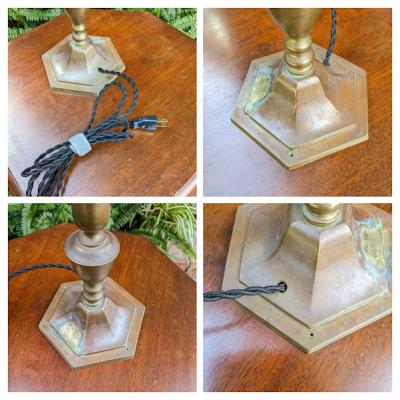 真鍮ベース部分は時間を経て味わい深い光沢を持ち、土台に見られる緑青(ろくしょう)も、長年の経年変化による自然な風合いとしてアンティークらしさを際立たせています。小さな穴が2ヶ所開いているので土台に固定して使用されていたものと推察されます。