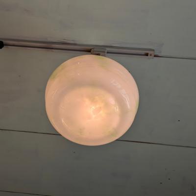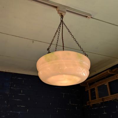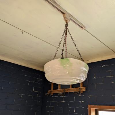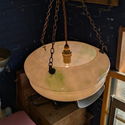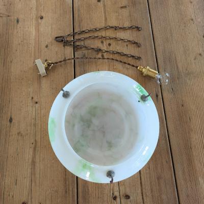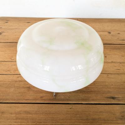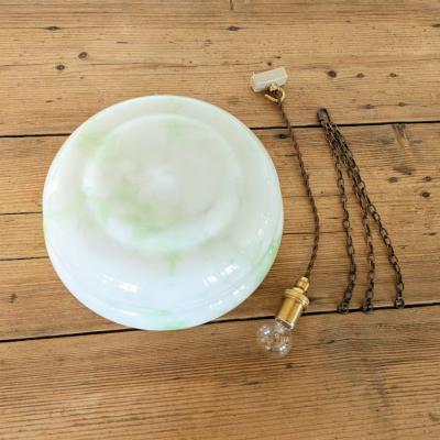 乳白色のオパールガラスに、さわやかなグリーンの色ガラス片を溶かし込んだアールデコのハンギングボウル【45-413G】