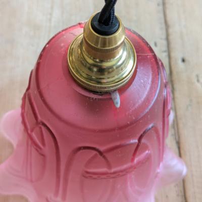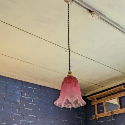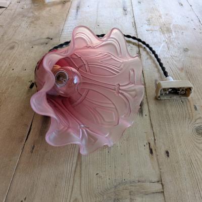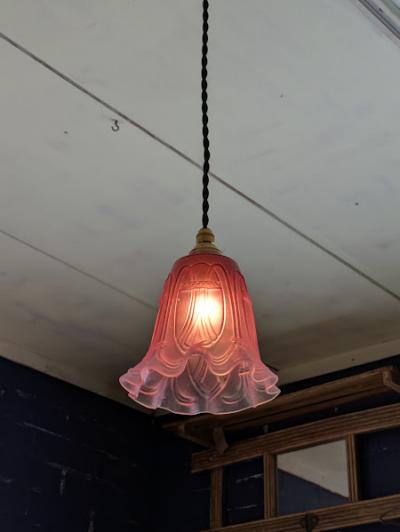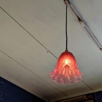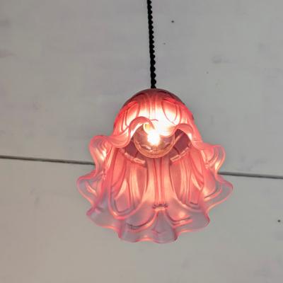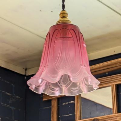 貴重なクランベリーガラスを思わせる上品なピンクのグラデーション。下部が波打つフリル状で、チューリップが開いたような優美なフォルムで 植物のつるや花を模した流れるような美しいレリーフに古いガラス特有の気泡を含んでいるため、点灯時に光の陰影が浮かび上がります。