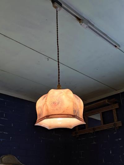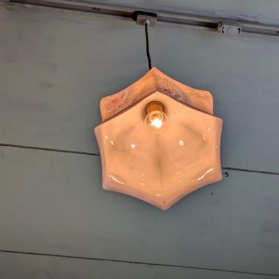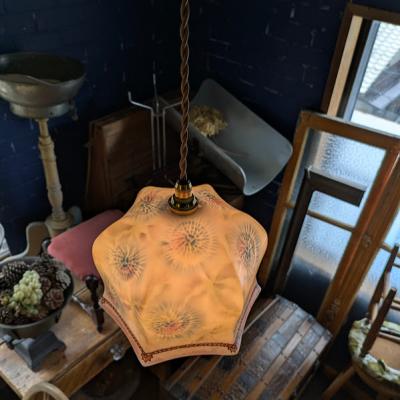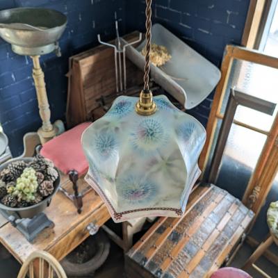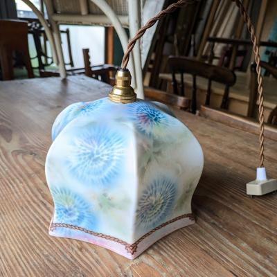 フチのロープのようなデザインは手書き、お花のように見える部分ふんわりとパステルで描いたような転写のようです。昼間に下から眺めると、うっすらと模様が透けて見え灯りがなくても十分楽しめます。優しい色使いがすっと部屋に馴染む印象です。