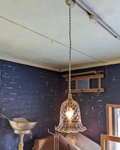 LED電球も使える、口金サイズE17の真鍮ソケットに加え、コードと角型シーリングは新しい物と交換してあります。撮影時コードは茶色、長さ約42㎝を使用していますが、コードの色は「黒、白、茶色、スモーキーベージュ」の中からお好きな色に交換できます。コードの長さ調整可能、別途有料となります。福岡市南区の店舗にてお渡しもできますのでお気軽にどうぞ!
