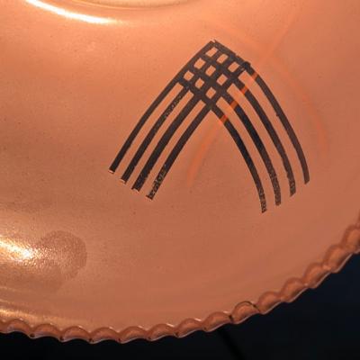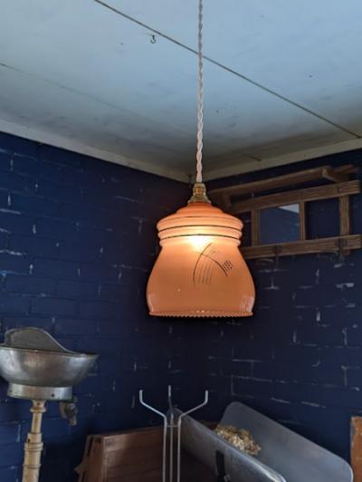 時代を感じるオパリン系ガラスに、すっと引かれた細いゴールドラインが映え、落ち着いた可愛らしさを添えています。側面の扇のような曲線模様はどこか和の雰囲気もあり、ヨーロッパらしい装飾の中に東洋的な要素がさりげなく混ざった魅力的なデザイン。裾は小さなスカラップ状で、点灯すると柔らかい陰影が生まれます。玄関、ダイニング、カウンター照明などにもよく映える雰囲気の良い一点です。