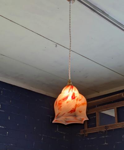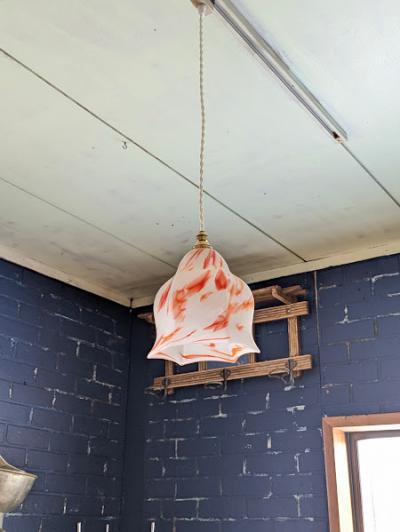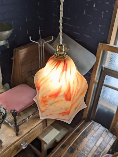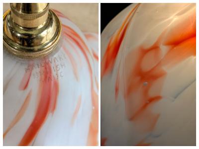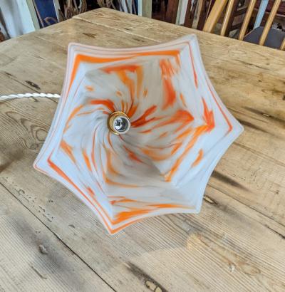 BRITISH MADEの 刻印入りのガラスシェードです。乳白色のガラスにオレンジのマーブル模様が流れるように広がり、手作業ならではの個体差のある仕上がりが魅力です。