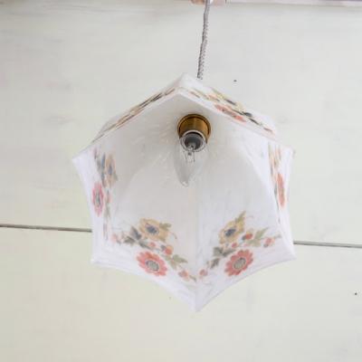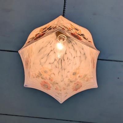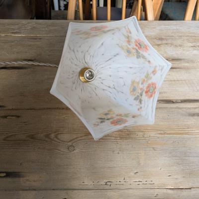 乳白ガラスに描かれたハンドペイント風の花柄は、自然光では落ち着いた色合いで上品かつクラシカルな雰囲気に、点灯時には電球色の光を受けてふんわり浮かび上がり、ノスタルジックな表情を見せます。