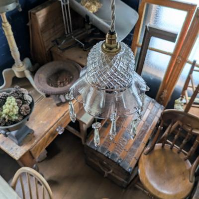 上部は細かなダイヤ状カットが施され、下部は大きく広がるフリル形状。その縁には雫型と八角形のクリスタルパーツがバランスよく配されています。点灯時にはカットガラスとクリスタルが光を反射・屈折し、天井や壁にきらめく陰影を生み出す華やかな印象で、英国照明らしい装飾性を感じさせます。