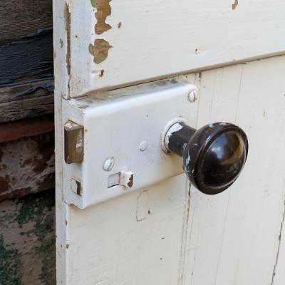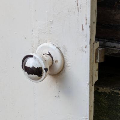 白くペイントされた木製ドアは、経年によるペイントの剥がれや小傷から、長く使い込まれてきた英国アンティークならではの味わいがあります。厚み約1.5cmと軽量で、イギリスでは室内の間仕切りや収納、サービスドアなどに使われていたタイプとのこと。