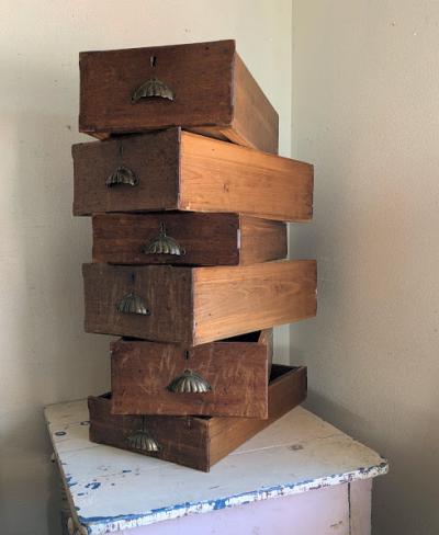 サイズはすべてバラバラのため、高さを変えて重ねたり、あえてラフに積み上げたりと、ディスプレイ次第で表情が大きく変わります。店舗什器としての見せる収納、アクセサリーや小物の整理、撮影用の背景小道具、ガーデンやアトリエの演出など、アイデア次第で幅広く活躍します。アンティークならではの雰囲気を、ディスプレイや収納に取り入れてみてください。