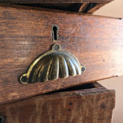 長年使い込まれた無垢材ならではの木肌の表情や、擦れ・小傷・色むらが一つひとつ異なり、同じものが二つとない点が大きな魅力。真鍮製と思われる取っ手や鍵穴のディテールも雰囲気があり、置くだけで空間に英国アンティークらしい味わいを添えてくれます。