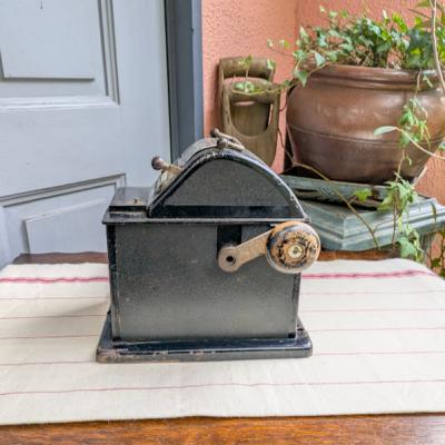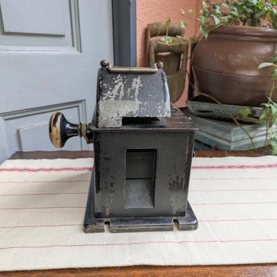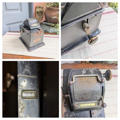 ハンドルはスムーズに回転し、回すごとにカウントが計上され、しっかりと管理されていたことが伺えます。赤いインクの跡も残っており長きに渡り使用されていたことが証明されています。大切に保管するための専用キャリングケースも付属しているのも素敵ですね。
